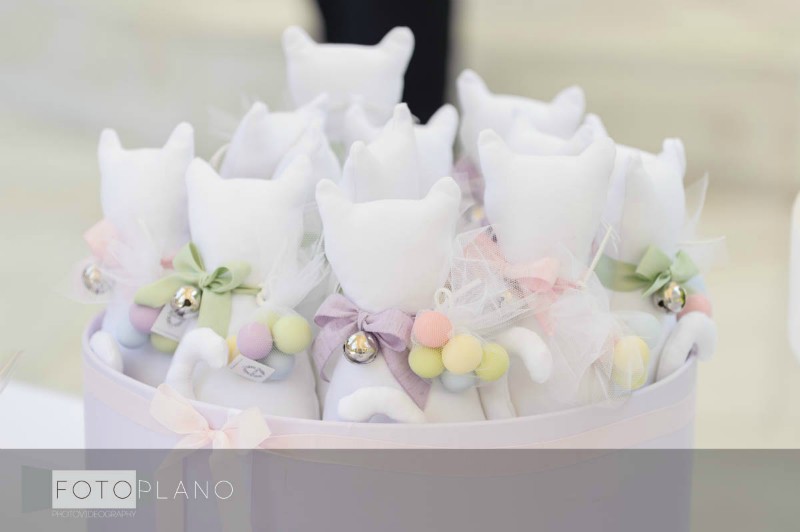 Μπομπονιέρες παιδικές γατάκια σε μεγάλο μέγεθος με παστέλ κορδέλες και μεταλλικό κουδουνάκι.