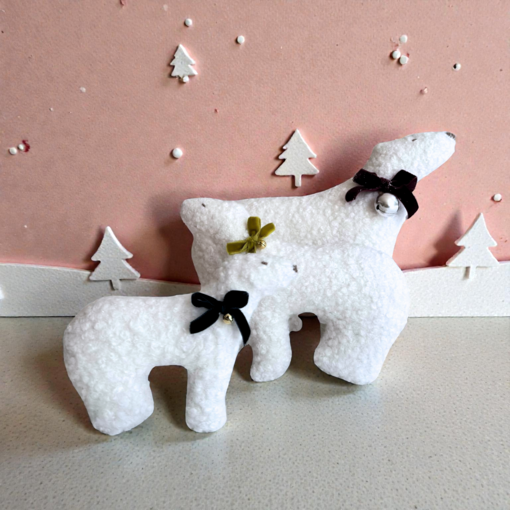 Το σετ των Χριστουγεννιάτικων αρκούδων (3 τμχ.) είναι μια τρυφερή πρόταση διακόσμησης που δημιουργήθηκε για να γεμίσει το παιδικό δωμάτιο με ζεστασιά, φαντασία και γιορτινή μαγεία. Σχεδιασμένες με προσοχή στη λεπτομέρεια και κατασκευασμένες από απαλό μπουκλέ ύφασμα, βελουτέ φιόγκους και ασημί κουδουνάκια. Το σετ μπορεί να αποτελέσει κομψή διακόσμηση σε ράφι, παιδική βιβλιοθήκη, γιορτινή γωνιά αλλά και σε βάπτιση ή θεματικό πάρτι.